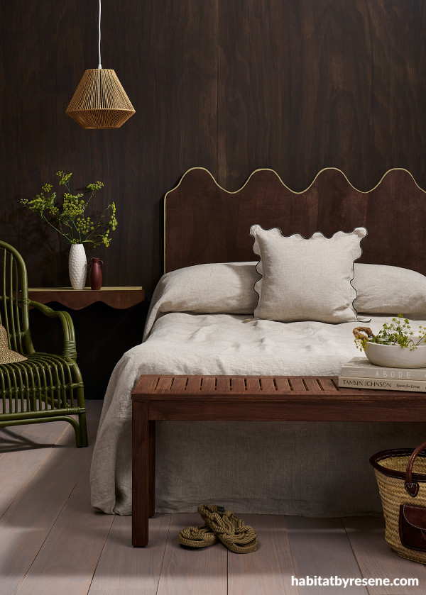 Walls stained in Resene Colorwood Charred Black, bedhead and floating shelf in Resene Colorwood Bark with contrast painted in Resene Colins Wicket and vase in Resene Waiouru. Linen from Kinship Linen, lightshade from Mitre 10. Project by Melle Van Sambeek, image by Bryce Carleton.