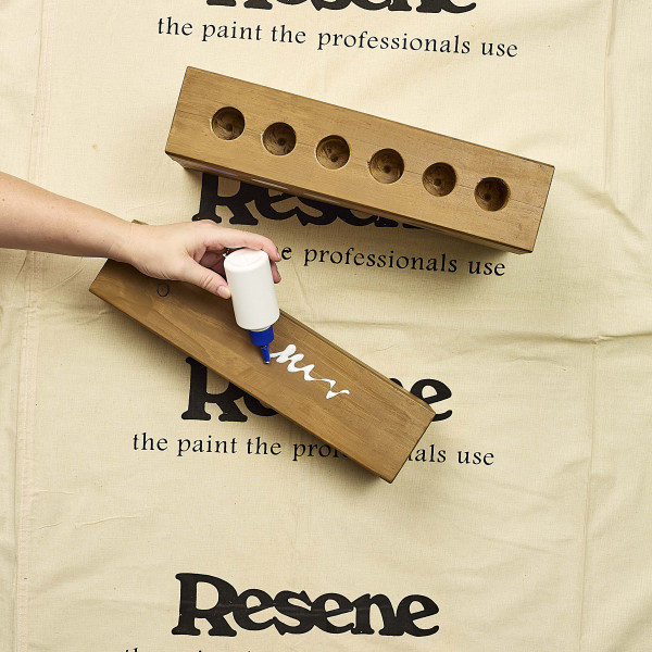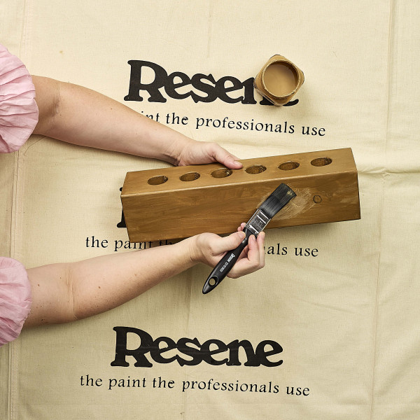 Step two: Sand the wood pieces, including the holes then wipe with a damp cloth. Stain all the wood pieces in Resene Bask. Leave to dry.
