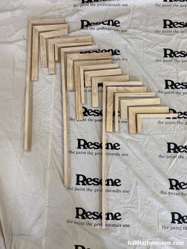 10 x 25cm lengths cut on a 45-degree angle so the 18mm width sits flat