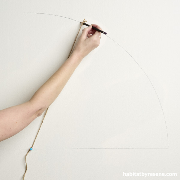 Step 3: Tie a piece of string to a pencil, tying as close to the tip as you can. Using your centre point, either firmly hold, or pin your string in place. Keeping the pencil straight, draw your first semi-circle. Repeat on the second guide line.