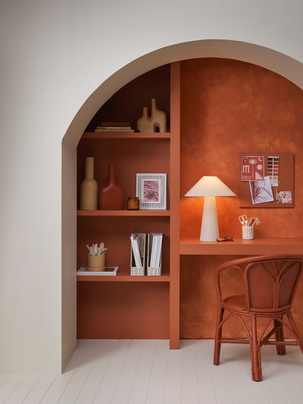 This built-in office nook adds depth and warmth to an otherwise neutral space. The front walls are painted in Resene Quarter Spanish White, with back wall in Twizel with Resene FX Paint Effects Medium in Spanish White over the top. Project by Vanessa Nouwens, image by Melanie Jenkins.
