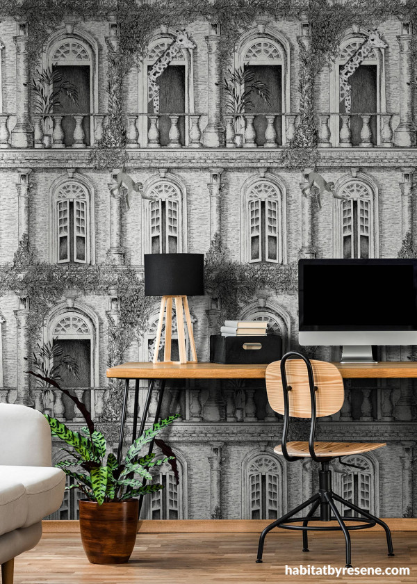 This minimal office has some added texture with a wall in Resene The Icon Edit Black & White Wallpaper Collection 64503. The wooden floor and desk ground the room and keep things simple and warm.