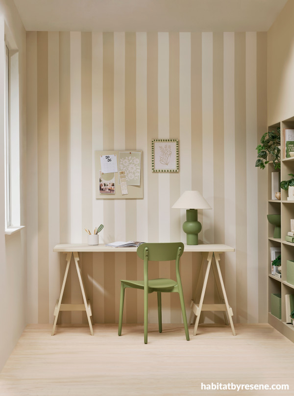 This relaxed, neutral office features stripes and pops of green for texture and colour. The walls are in Resene Eighth Fossil and Half Fossil, floor in Resene Colorwood Whitewash, desk in Double Fossil and chair in Finch. Project by Vanessa Nouwens, image by Melanie Jenkins.