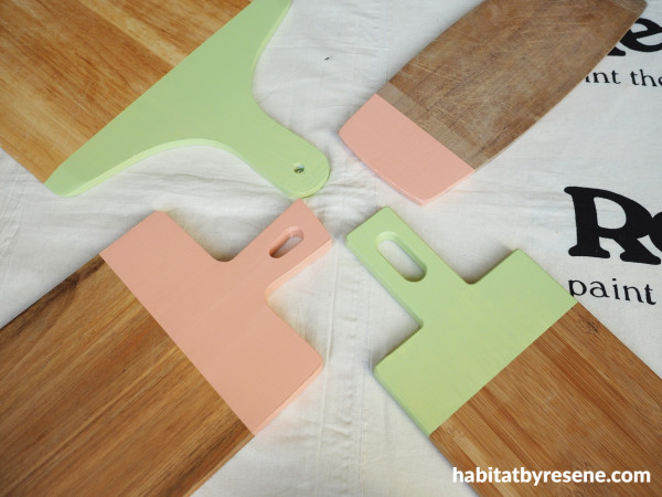 Step 1: Start by washing the boards in hot soapy water to remove any food oil. Leave them to dry completely. Sand the area that you want to paint with medium grit sandpaper. Wipe the dust away. Apply painters tape to tape off the area that you want to paint and then prime this area with one coat of Resene Quick Dry. Once this is dry, paint the same area with your base colour. Fleur used Resene Vermont and Resene Japonica.