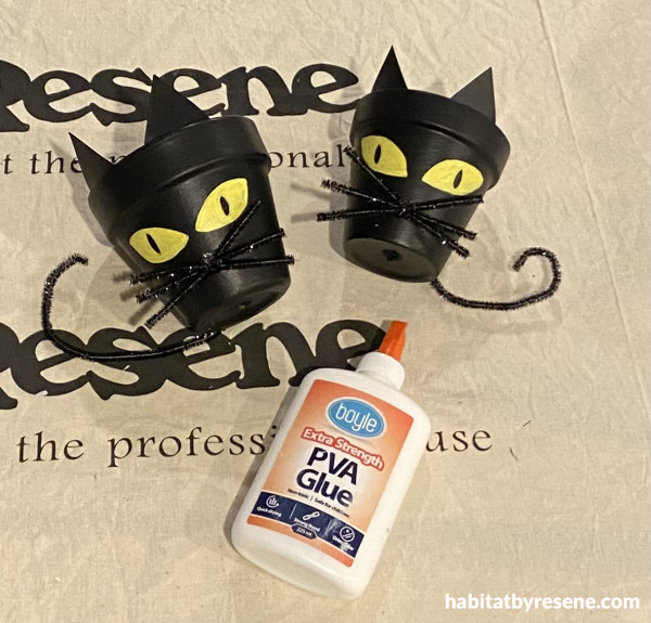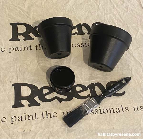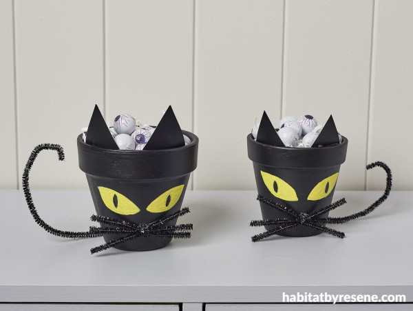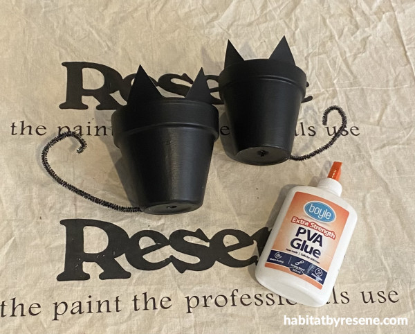 Step 1: Paint your two pots in your chosen Resene colour. We used Resene Black for your typical ‘spooky black cat’. You will need two coats for best coverage.