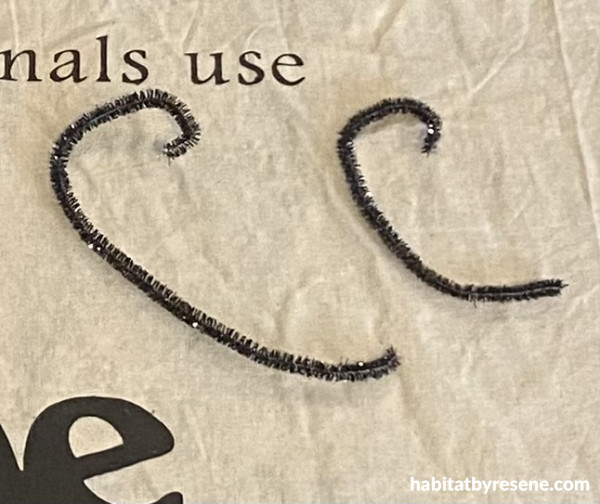 Step 6: Take three pipe cleaners and cut them in half. Then take three of the cut pipe cleaners and twist another one around the middle to make the whiskers. Repeat for the second lot of whiskers.