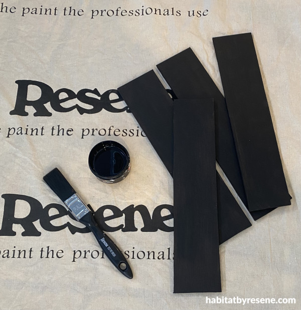 Step 4: Paint your stripes of wood in another of your chosen colours. We used Resene Black.