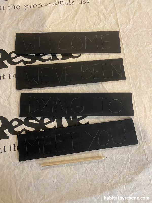 Step 7: Write the words ‘Welcome we’ve been dying to meet you’ on the painted strips.