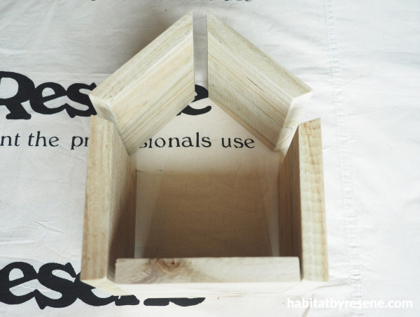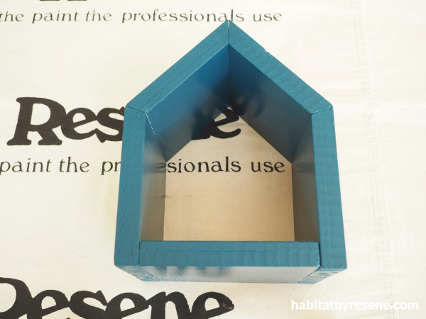 Sand all the rough edges smooth, wipe away any sanding dust, and then prime all your pieces of wood with one coat of Resene Quick Dry. Once this is dry, paint with two coats of your chosen colour. Fleur used Resene Teal Blue for her birdhouse.