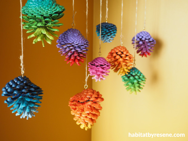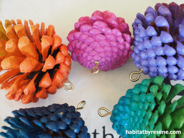 Step 1: Paint the pinecones with a graduated colour scheme. Start with one colour at the top of the pinecone and work your way to the base with two or three other colours. Don’t wash out your paint brush between colours, as the mixing of the two colours makes for a better gradient. You can make your pinecones as colourful as you like in any of your chosen shades. Here are the colours Fleur used: