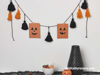 Tip: You can also make other creatures like ghosts and pumpkins using popsicle sticks in the same way, just switch up the colour and the faces! Tape some string onto the decorations and add wool tassels to create a garland as seen below.
