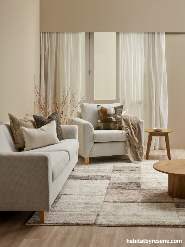Bring warmth inside on cold days, creating a space you never want to leave – or at least curl up under a blanket for as long as you can. Pick a palette like warm, earthy tones and scatter this throughout your décor and design like in these cushions, rug and furniture from OLLO. Try cosy neutrals like Resene Triple Merino, Resene Blanc, Resene Spanish White and Resene Akaroa.