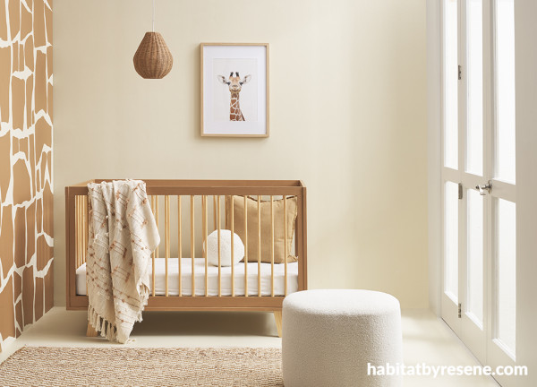 Before you start buying furniture and setting up the room, think about how you want your nursery to feel. Create a moodboard with colours, textures and materials that inspire you. As an example, we’ve gone for a playful yet stylish ‘savannah theme’ using a giraffe pattern, natural materials like wood, rattan and linen, alongside warm neutrals like Resene Spanish White, Resene Double Spanish White, Resene Canterbury Clay and Resene Brown Sugar. These neutral hues suit any gender and also work well as a space that grows with your child. A simple, adaptable palette now, means fewer makeovers later!
