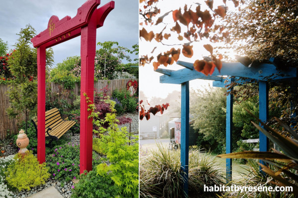 Add a pop of colour to your garden with a painted arch. (Left) Winner of Resene’s Garden Glow Up competition, homeowner Chris and her husband transformed their garden into a Japanese-inspired sanctuary including an arch painted in Resene Rock N Roll and Resene FX Metallic Gold. (Right) Amy’s Villaleigh Gardens and Nursery draws in visitors with its abundant flowers and vivid hues like Resene St Tropaz on this archway. Image by Ruth Gilmour.