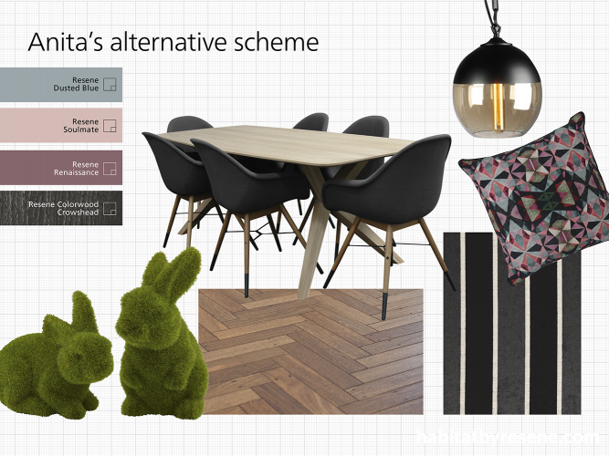 Products featured in Anita’s scheme include a parquet floor finished in Resene Aquaclear by James Henry; a Campa Dining Table and Chairs from Hunter Furniture; Moss Bunnies from Freedom Furniture; Kaleidoscope Cushions from Me And My Trend; window seat fabrics Trove and Baja from Textilia; and Hank Pendant Lights from Eden Light.
