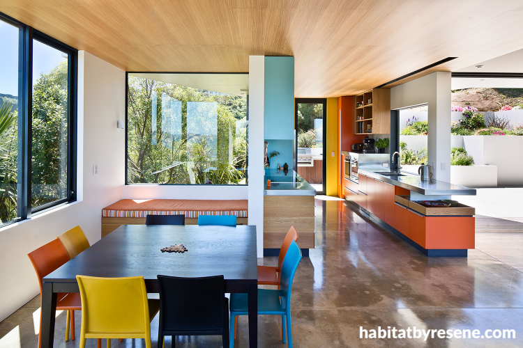 Their palette of playful, unique and interesting colour began in the kitchen where they chose Resene Trinidad (orange) for the lower cabinets, Resene Kumutoto (aqua) for the wall cabinets Resene and Banana Split for the end wall. The other walls are in Resene Bianca with the polished concrete floor and plywood ceiling providing natural elements.