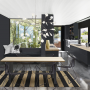 Products used in Rachel’s scheme include a Splay Table, Timothy John High Sidekick Barstools, Tall Brass Geo Vase and Mercury Linen Cushion all from Paper Plane; Portobello Chairs from Ico Traders; an Armadillo & Co Nest Weave Awning Stripe Rug from The Ivy House; and a Heracleum 11 Small Pendant Light by Moooi from ECC Lighting.
