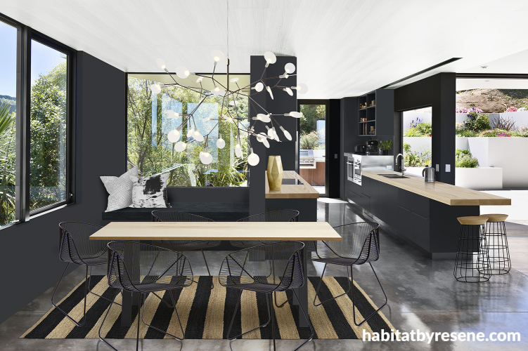 A striking look is created by Rachel Tabb with walls and kitchen cabinetry painted in Resene Grey Friars, the plywood ceiling painted in Resene Quarter Alabaster, and accents of pale timber on the benchtop and furniture.