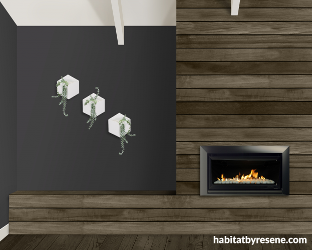 Go all dark and broody with the lodge-inspired look. Walls in Resene Half Bokara Grey are offset by a rustic-looking chimney breast clad in pine timber boards that are then stained in Resene Colorwood Walnut. A low-slung shelf, or seat, is also made of pine and stained. The ceiling is painted in Resene Sea Fog, the soft white tones of which are echoed in the wall planters.