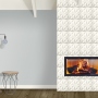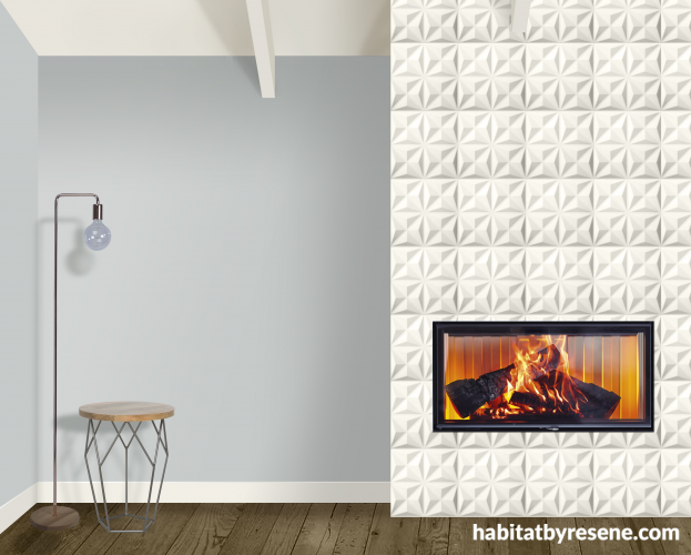 A crisp look with an unusual sculpted wall panel by My Wall Art beautifully highlights this fireplace setting. The main walls are in Resene Duck Egg Blue while the Cullinans design panels are painted in Resene Alabaster, along with the ceiling and trims. Add a simple contemporary side table and lamp, and an unusual frameless fireplace, for a pared back but striking look.