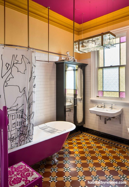 Debra’s main bathroom houses a range of vivid colours that alongside original tessellated tile and stained-glass window brings the room to life. The ceiling is painted in Resene Sassy, the cornice is in Resene Pizza, the walls are in Resene Golden Glow and the cupboard is in Resene Black.