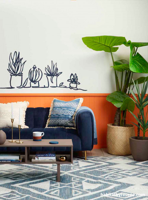If you have trouble caring for plants, why not paint them on the wall. This continuous line mural of succulents is painted in Resene Midnight Express onto the Resene Rice Cake wall– a bold contrast with the tongue-and-groove panelling in bold orange Resene Smoke Tree. Floor in Resene Colorwood Mid Greywash, coffee table and large pot and round vase in Resene Felix and coasters in Resene Bunting. Project by Laura Lynn Johnston. Image by Bryce Carleton.