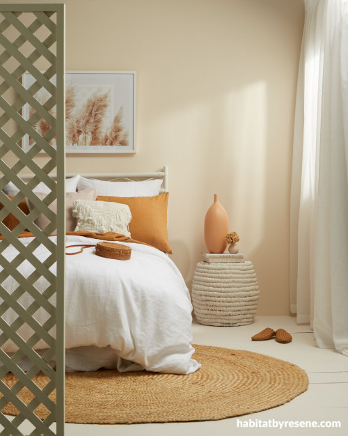 Resene Canterbury Clay walls create a light and airy atmosphere. The floor is painted in Resene Eighth Joss and the lattice is in Resene Eighth Pavlova. The large pot is in Resene Beethoven and the bedhead is in Resene Eighth Joss. Project by Melle Van Sambeek. Image by Bryce Carleton.