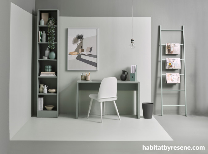 The deep Resene Ravine wall of this office contrasts with the inner square in Resene Pumice. The desk and bookshelf are in Resene Blue Smoke and the chair is in light Resene Harp. The rubbish bin is in Resene Armadillo and the ladder is in Resene Pewter. Project by Vanessa Nouwens. Image by Wendy Fenwick.