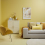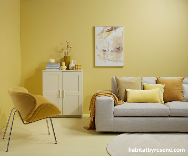 This yellow room pairs a Resene Chenin wall with a floor in Resene Mellow Yellow. The cabinet is in Resene Double Spanish White. Project by Vanessa Nouwens. Image by Bryce Carleton.