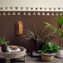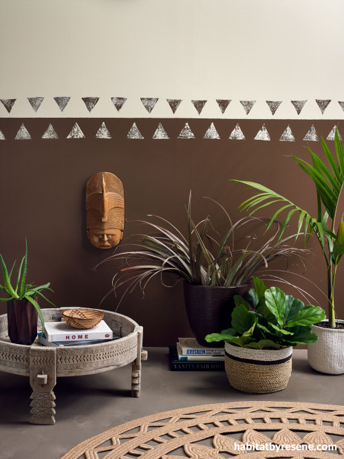 This creative wall uses Resene Bronze on the lower half and Resene Triple Wheatfield on the top half with a simple sponge stencil accenting the dividing line. The large pot is in Resene Wood Bark. Project by Megan Harrison-Turner. Image by Melanie Jenkins.