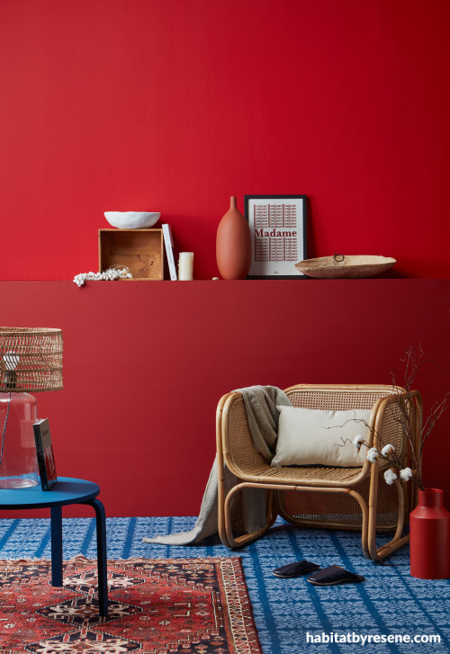 This boldly beautiful space showcases two striking reds, which have been cleverly used together for added dimension. Resene Poppy has been painted on the upper wall and Resene Dynamite is on the lower wall. To add to its richness, further layering of red comes with a floor vase painted in Resene Raging Bull, the shelf vase in Resene Moccasin and the exotic earthy toned rug. A Moroccan-style stencil is used to pattern the floor and amp up the texture, painted in a base colour of Resene Wishing Well with Resene Time After Time over top. Coffee table in Resene Wishing Well, bowl (on box) in Resene Elderflower.