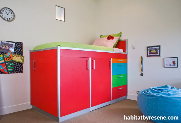 And here, its close colour cousin, Resene Guardsman Red, is shown on another holiday classic – the bunk bed. Other colours used on this creative piece of furniture designed by homeowner Michelle Elsmore for her son Sam are Resene Trinidad (orange), Resene Wham (green) and Resene Zomp (turquoise).