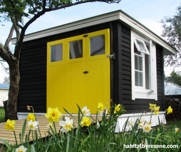 The colour of this recycled segmented garage door is actually Resene Turbo. The shed was designed and made by Darren and Sharon Hunter of Hunter Design and Red Shed out of demolition materials on the couple’s holiday property in Martinborough.