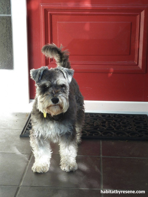The iconic, classic colour of Christmas has been transported from its European roots to the colour of the flowers of our majestic pohutukawa tree. We wait with bated breath in the North Island for the grey-green buds to burst forth, often doing so just before Christmas Day. It’s a bit like our Northern Hemisphere cousins waiting for a white Christmas. It’s a popular front door colour, as seen here with Juju the miniature schnauzer.