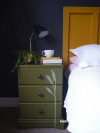 Inspired by the elegant shape of flax and colours of nature, Fleur painted basic drawers in Resene Waiouru, and stencilled a toi toi motif in Resene Flax. Drawers are a perfect canvas for getting creative, giving you enough space to go pattern crazy, or simple with a stencil like this one. Click here for the DIY. The wall is painted in Resene Tuna.