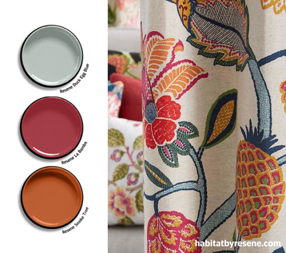 Earthy hues such as Resene La Bamba and Resene Smoke Tree bring warmth this season, softened by the ever popular Resene Duck Egg Blue. This Floranova fabric from Warwick sums up the look.