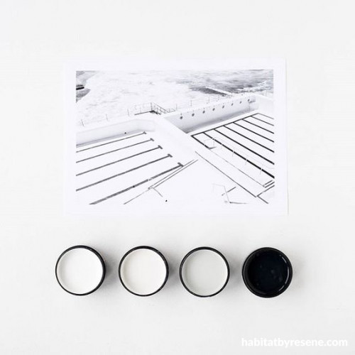 Scandi and minimalism for interior design is still popular and inspires this colour combo. These testpots from left are Resene Eigth Black White, Resene Double Black White, Resene Quarter Stack and Resene All Black. Styling by Amber Armitage.
