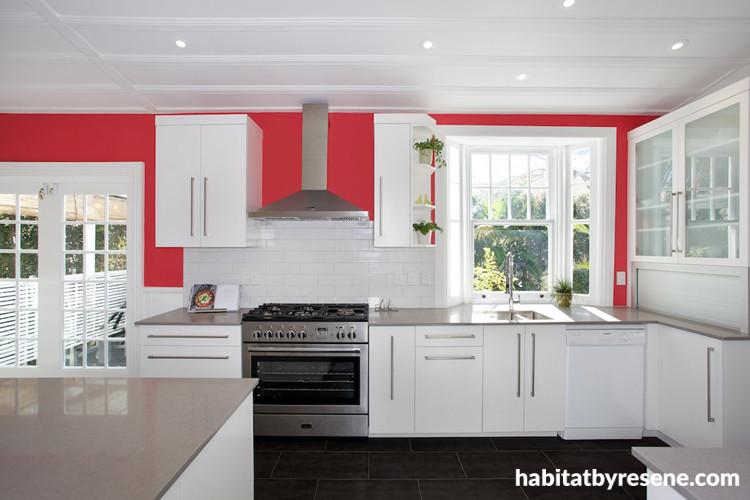 Here’s a kitchen that would make you smile each and every day. Designed by Susan Templer, the bright red Resene Vibe walls were chosen to match a favourite painting while the cabinets are in Resene Black White.