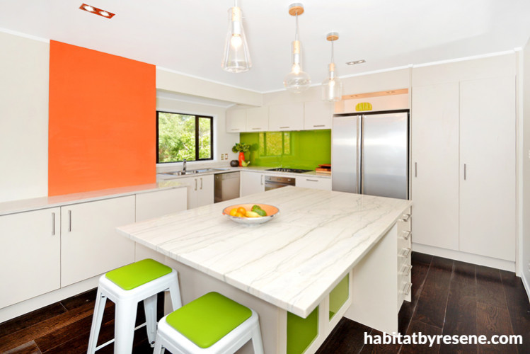Says Amanda of the kitchen: “The house sits in amongst farmland with a lot of green around it. We wanted to bring this into the house with a youthful energy which lime-based greens (Resene Kombi) do, and then overlay that with a pop of the orange (Resene Ayers Rock). Orange stimulates conversation and adds energy.”