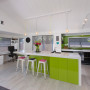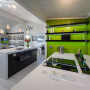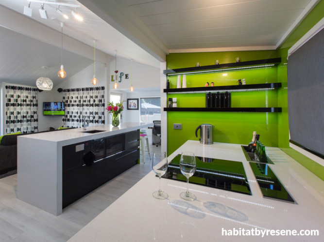 Another view of Tracy’s kitchen, showing how the Resene Lima back-painted glass is carried around onto the side wall.