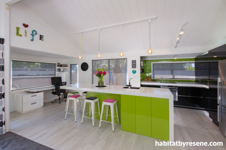This old Lockwood home has been superbly updated by designer Tracy Murphy of Vekart Kitchens, using Resene Quarter Merino on the timber walls and ceilings, against which Resene Lima shines out from the island bench and around the window.
