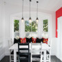 To complement the kitchen designed by Susan Templer, the dining furniture was upcycled with paint. The table and chairs were painted in Resene Black White, with other chairs in Resene Cloudy and Resene Blackjack. The red wall is in Resene Vibe while the others are Resene Black White.