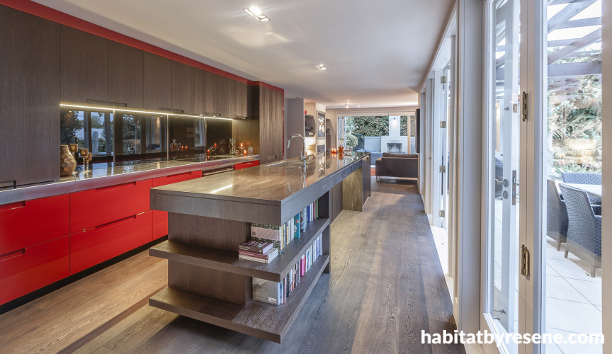 Designer Mal Corboy framed these oak wall cabinets in Resene Whizz Bang, and also used this dark orange on the lower cabinets. He was going for a smoky sophisticated cigar lounge look… and nailed it. The recessed handles and orange also give the kitchen a subtle retro look.