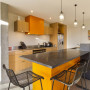 If painting the cabinets or walls in yellow or orange is too much for you, choose punchy accessories like these yellow bar stools.