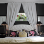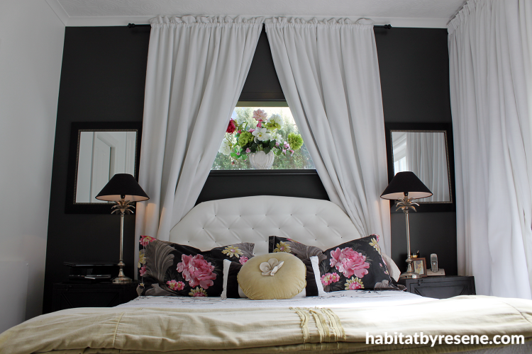 Proving a black feature wall in the bedroom isn't only reserved for angsty teenagers... this bedroom is painted in Resene All Black and Resene Porcelain and looks superb.