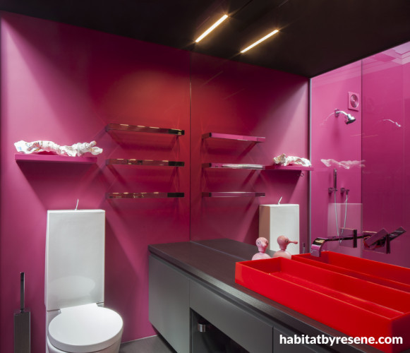 Hot pink walls and a red rubber basin... Not for the faint-hearted, this bathroom belongs to Jan Warburton, and the colour (Resene Lipstick) was suggested by her fashion designer daughter Clare. We take a look at her home in a previous house feature: Jan's off-the-wall home design.