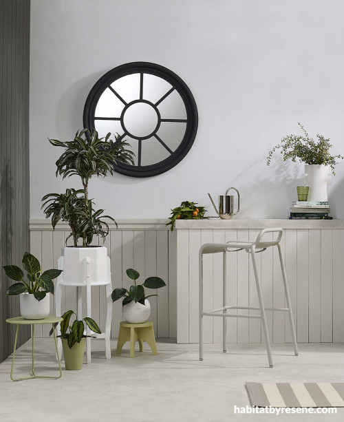 This lush conservatory is brought to life with Resene Double Merino on the back wall, the left wall in Resene Quarter Karaka and the back wall bench and boards in Resene Quarter Merino. The top of the bench is in Resene Quarter Merino with Resene FX Paint Effects medium coloured with Resene Foggy Grey. The floor is in Resene Foggy Grey with Resene FX Paint Effects medium coloured with Resene Quarter Merino. Tall white planter painted in Resene Quarter Merino, small cork stool in Resene Quarter Crisp Green and mirror in Resene Nero. Barstool from Jardin. Project by Kate Alexander. Image by Bryce Carleton.