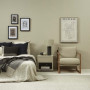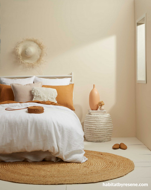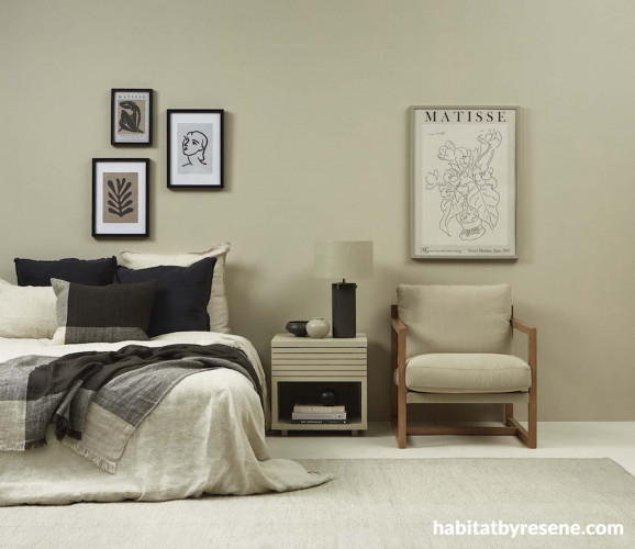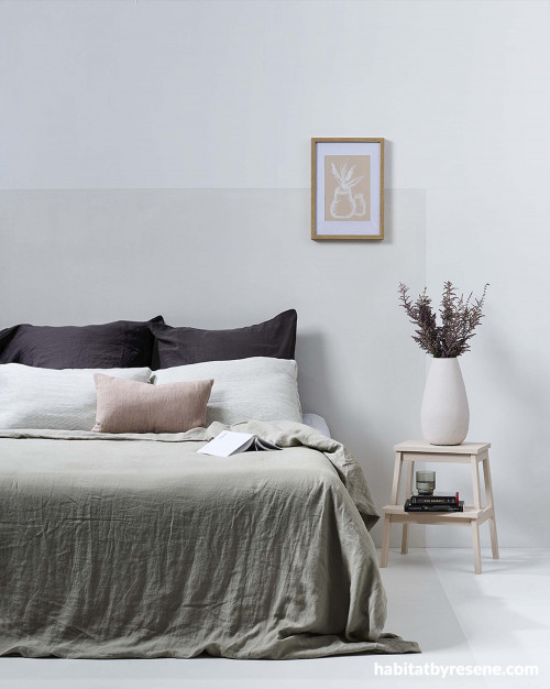 This calming bedroom’s walls are in Resene Tea and the floor is in Resene Blanc. The bedside table is in Resene Bison Hide and bowl in Resene Black. The lamp is in Resene Bison Hide with a Resene Black base. Duvet cover and cushions from Adairs, chair from Freedom, throw and rug from Citta. Project by Vanessa Nouwens. Image by Bryce Carleton.