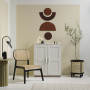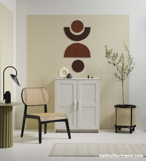 This relaxing space features walls in Resene Double Spanish White with borders in Resene Eighth Spanish White. The floor is in Resene Quarter Spanish White and the cabinet is in Resene Quarter Spanish White. The timber shapes are stained in Resene Colorwood Meranti and Resene Colorwood Dark Oak. The Art Deco table is in Resene Clay Creek, small vase in Resene Half Bokara Grey and larger vase in Resene Eighth Spanish White. Rattan chair and plant pot from Cane Collective, lamp from 10 Curated, rug from Briscoes. Project by Melle van Sambeek. Image by Bryce Carleton.