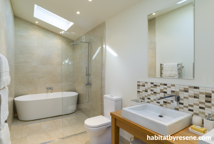 Making the most of a specified wet area and freeing up more floor space in what is usually a small space, this ensuite cleverly places the free-standing bath into the shower stall. The walls are in Resene Pearl Lusta and this bathroom is in a house featured in the latest Habitat magazine.